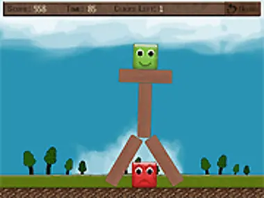 Remove wooden platforms & try to get the green block to the ground, without touching the red block.
