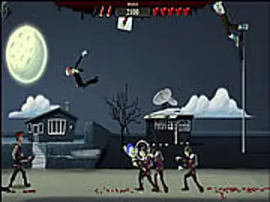 Shoot the incoming waves of zombies. Watch out for ones that jump towards you fast.